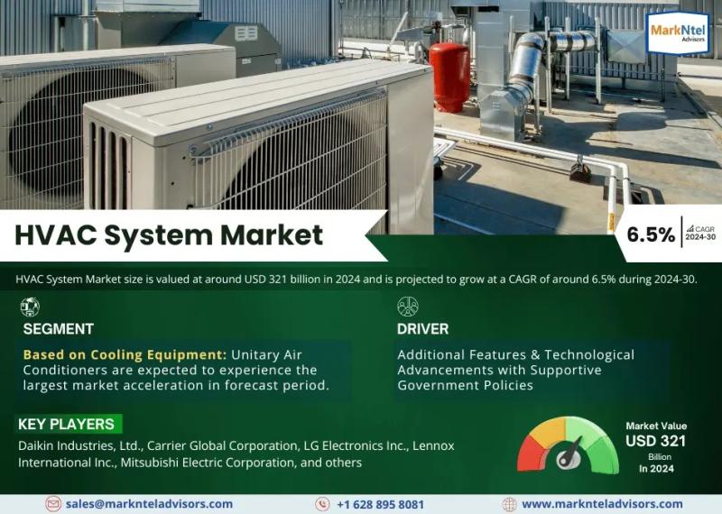 The Global HVAC System Market is set to witness significant growth, with market valuation estimated at approximately USD 321 billion in 2024. According to the latest research report published by MarkNtel Advisors, the HVAC System Market is projected to grow at a robust CAGR of 6.5% between 2024 and 2030.