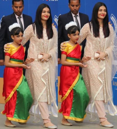 Aishwarya Rai Bachchan sported a beige Kurta set by Falguni Shane Peacock at a public event. The chrome applique Kurta design for women includes ivory silk threads and is replete with ethnic motifs. The Kurta for women is teamed with Churidaar and a tulle Dupatta.