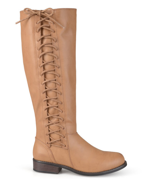 Set the trend in laced detail riding boots by Journee Collection. These boots feature premium faux leather uppers that rise to mid-calf and highlight crisscross lace-through detail on the sides.
