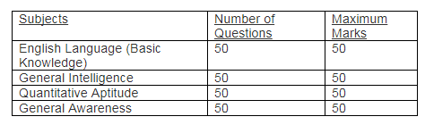 Tier I comprise four topics such as English Language (Basic Knowledge), General Intelligence, Quantitative Aptitude and General Awareness, Each topic consist 50 questions of 50 marks, The duration of the examination is 120 minutes (2 Hour) for each of the Papers, 0.25 Marks are deducted for each wrong answer s negative marking.