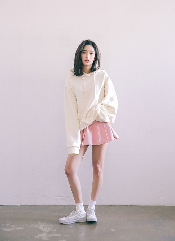 2. The next style is a mix of simple and sweet. Use a nude hoodie like white or cream and combine it with a miniskirt with pastel colors as you can see below.