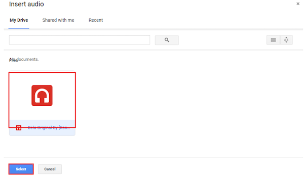 5- After clicking the Audio button, you will see a dialog box appear on the screen. In the dialog box, you will be able to see the audio file that you have just uploaded to your Google Drive.