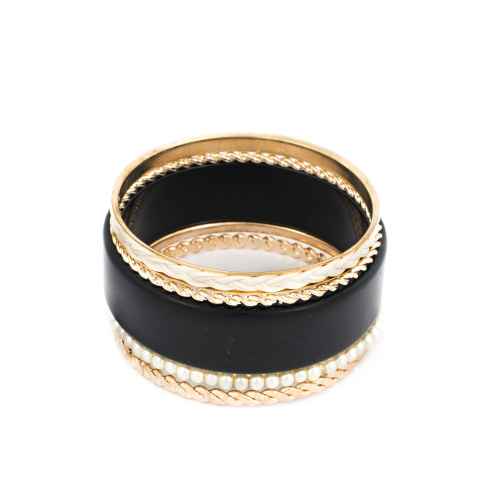 The best way to rock an accessory is by working your way around a single colour and wearing a bold coloured outfit to accentuate you entire personality. These black shimmer bangles are not flashy, but add a sense of boldness to your look. When matched with golden toned large bangles on the edges, they will look rich and royal. Such is the versatility of these bangles.