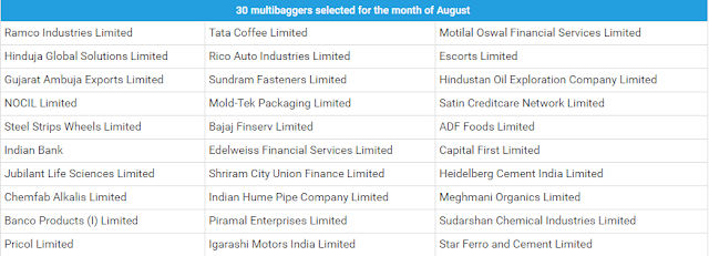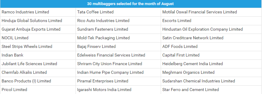 The 30 multibaggers selected for the month of August are as follows: