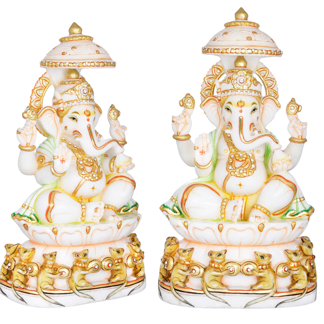Chaturbhuja holds his iconic implements in the rear hands and anterior hands hold a laddoo and the other held in abhaya mudra of fearlessness. The pitambara dhoti is tied tight below the paunchy belly and green stole falls down from sides across the shoulders; ornamented extensively in beauteous golds and that realistic expression of his eyes accentuates his deepness and divineness. Zoom in to have a look at the trunk decorated elegantly, postured in a Vedampuri pose, eating laddoo and the unique patterned yellow-orange tilak that glows on his forehead between the high-brows. The exquisite white and gold parasol attached at the top of his throne covers his flower aureole crowned head, decorated with soothing shiny stones. This sculpture is sculpted out of a single piece of marble in absolute smoothness and accurate curves and cuts.