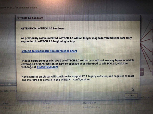 As previously communicated, wiTech 1.0 will no longer diagnose vehicles that are fully supported in wiTECH 2.0 beginning in July.