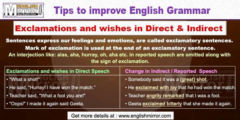 Exclamations and wishes statements. In the reported speech, an interjection like: alas, aha, hurray, oh, aha etc. are omitted along with the sign of exclamation.