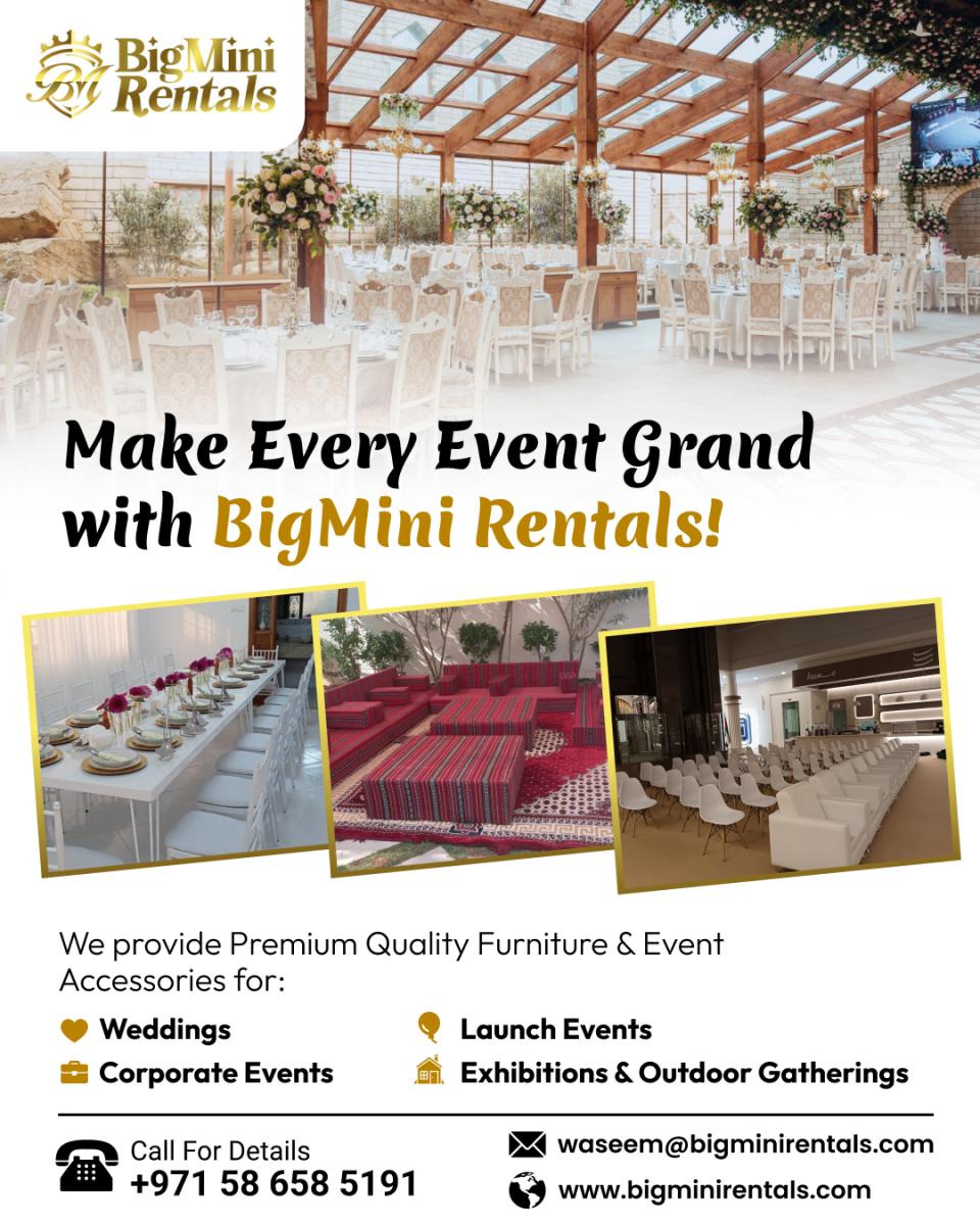 Wedding Party Rentals in Dubai, UAE - Bigmini Rentals offers furniture for rent for any types of Party or Events in UAE. Deals in Birthday Party Rentals Dubai, Wedding Party Rentals in Dubai, Best Party Rentals in Dubai.